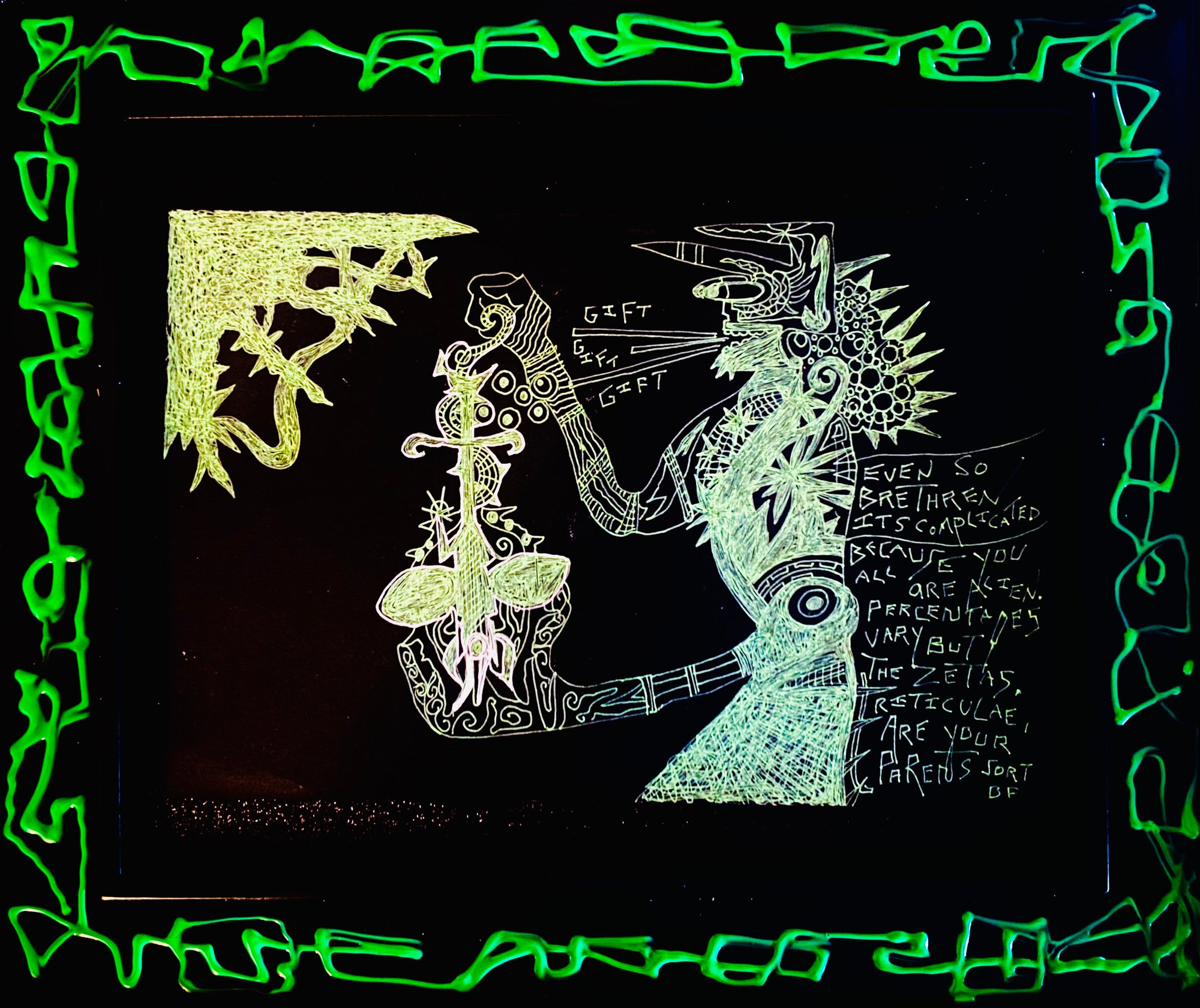 The title of this piece is also the title of a new song from The Obsessed - which you all will hear in a matter of months. About the art - a weird Mayan-esque priest-like character (with eye-stalks) bequeaths a cosmic artifact to a star. The dialogue directly references the fact that they were here a long time before us and enjoyed reproductive relations with humans.